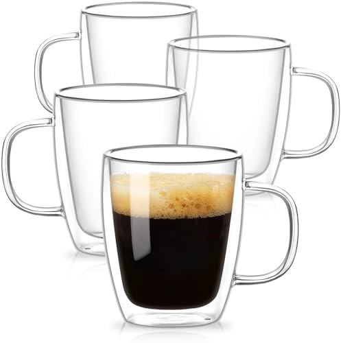 OJA 双层玻璃咖啡杯 4 件套,手工吹制12.5盎司(约354.4克)透明玻璃咖啡杯,隔热茶杯,非常适合浓咖啡、卡布奇诺、拿铁、美式茶包、饮料