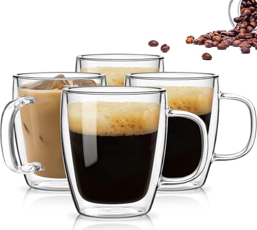 OJA 双层玻璃咖啡杯 4 件套手工吹制 14 盎司透明咖啡杯,耐热适用于卡布奇诺、茶、拿铁、浓缩咖啡、美式绝缘硼硅酸盐玻璃带手柄