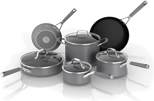 Ninja NeverStick 专业硬质阳极氧化 10 件锅具和平底锅套装,不粘炊具套装,经久耐用,可在烤箱中加热至 500 华氏度(约 260 摄氏度),石板灰,C39500