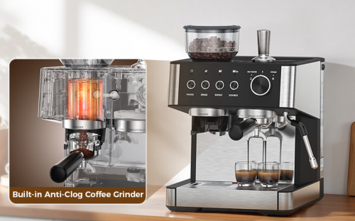 20 Bar 意式浓缩咖啡机,带研磨机:在家享受咖啡厅品质的咖啡! 意式浓缩咖啡机提供丰富、全口味的饮料,优化压力萃取,而蒸汽棒则可制作出丝滑的微泡沫,打造完美的拿铁咖啡。