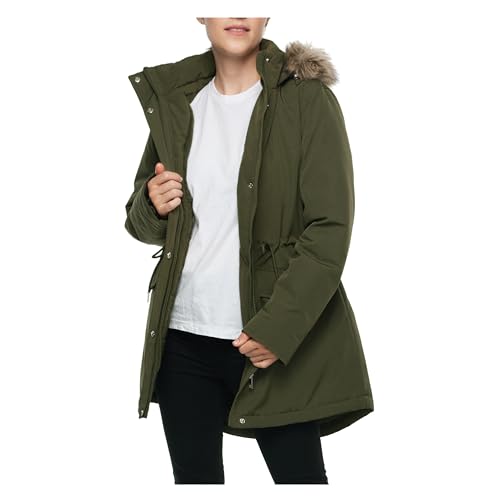 Rokka&Rolla 女式冬季外套迷你毛皮内衬加厚派克大衣,带可拆卸人造毛皮兜帽饰边, 橄榄色