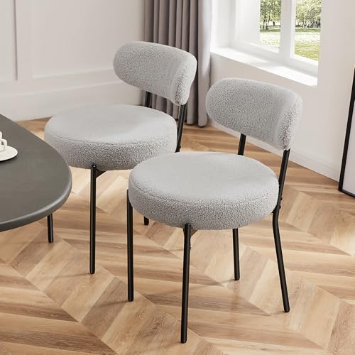 Sweetcrispy 餐椅2件套,Boucle 软垫现代中世纪圆形厨房椅带弧形靠背和金属腿,适用于梳妆台、客厅 - 经典灰色