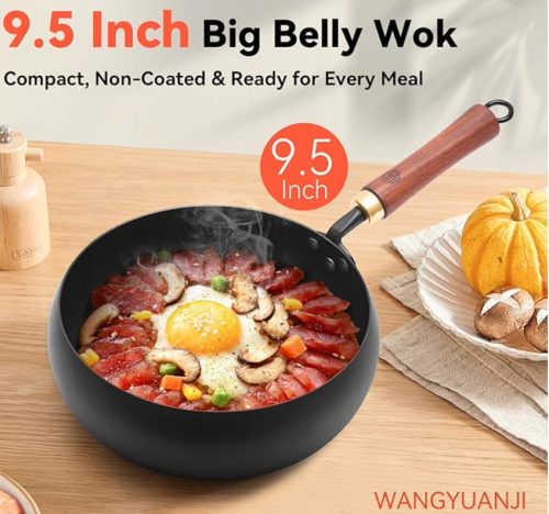 WANGYUANJI 12.6 英寸(约 31.6 厘米)带盖炒锅,平底炒锅,带可拆卸木柄,兼容所有炉灶