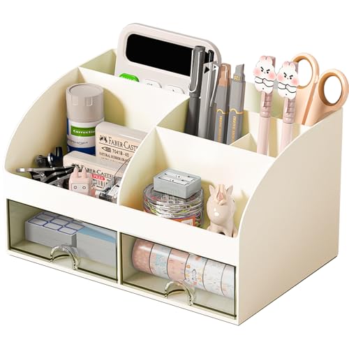 COMFYROOM 办公桌收纳盒,带 6 个隔层和 2 个抽屉,塑料化妆收纳盒,桌面存储笔架,学校、家居、办公用品的桌面收纳(象牙色)