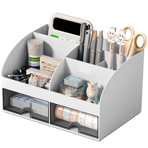 COMFYROOM 办公桌收纳盒,带 6 个隔层和 2 个抽屉,塑料化妆收纳盒,桌面存储笔架,学校、家居、办公用品的桌面收纳(白色-2P)