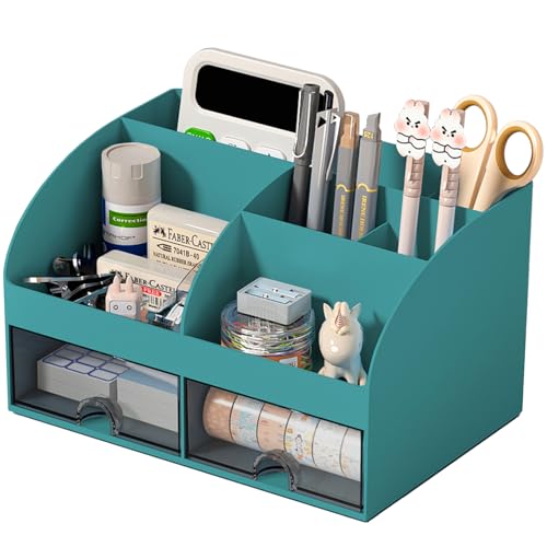 COMFYROOM 办公桌收纳盒,带 6 个隔层和 2 个抽屉,塑料化妆收纳盒,桌面存储笔架,学校、家居、办公用品的桌面收纳(深绿色)