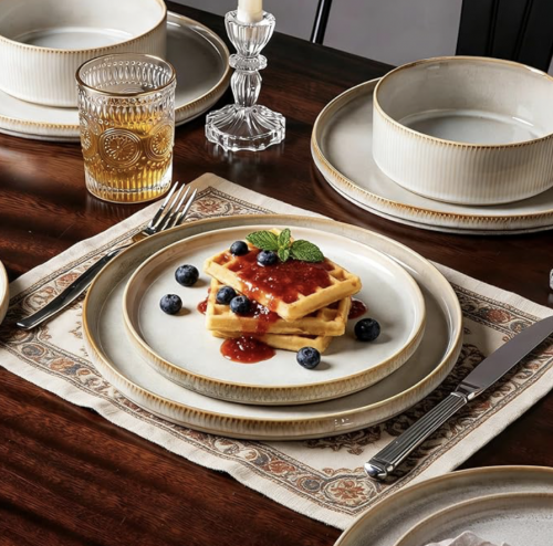 18件套白瓷套装,可供6人使用。套装包括晚餐盘、沙拉盘和杯各6个,蝴蝶花卉图案,餐盘直径11吋,沙拉盘9吋,杯容量12盎司。烤箱、微波炉、洗碗机...