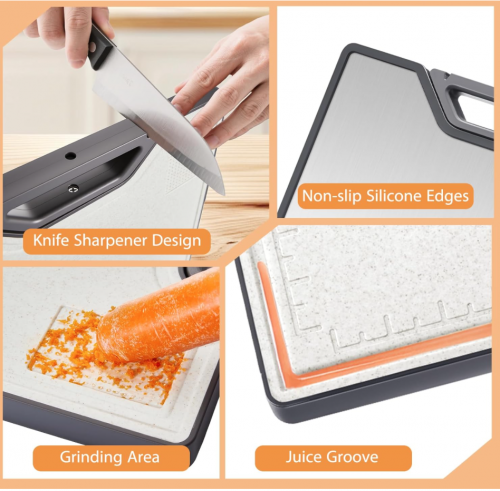 【双面多功能性】这款砧板的不锈钢非常适合切割肉类, 另一面小麦秸秆PP表面可轻松处理水果、蔬菜和草本植物。