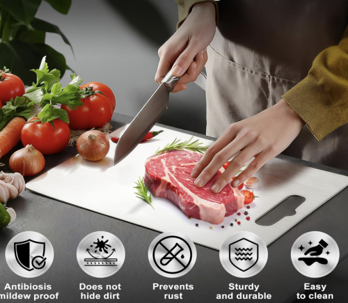 【钛砧板】由纯钛制成,符合食品接触标准,无毒,无异味。 与传统的砧板不同,它不会沾上污垢,不留异味,