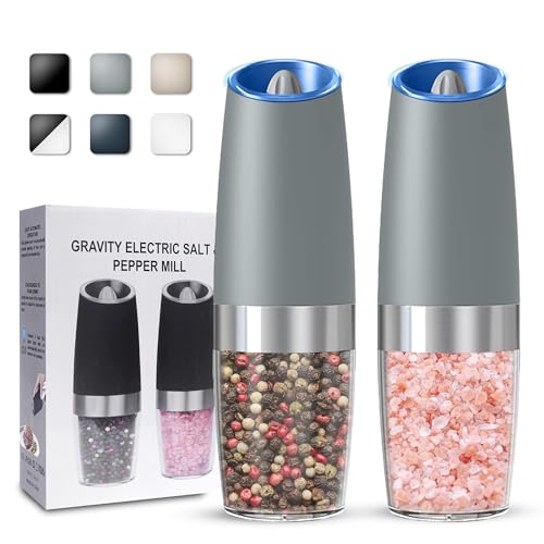 UNNEES 重力电动盐和胡椒研磨机 2 件套,自动盐和胡椒研磨器套装,可调节粗度,电池供电,LED 灯,2 件装,(浅灰色)