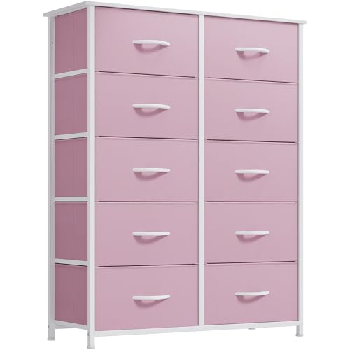 YITAHOME 10 抽屉梳妆台 - 粉色织物储物塔,卧室、客厅、走廊、壁橱的收纳单元 - 坚固的钢架,木质顶部和易拉布箱