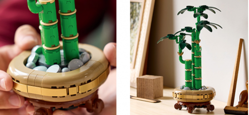 包括一个带有木质底座的花盆、鹅卵石和 3 根带叶子的绿色竹茎,外观栩栩如生。富责竹茎节形似竹节,富有竹韵,因为中国有“花开富贵”“竹报平安”的祝辞,因而其被赋予了“大吉大利”的美好寓意。 这款玩具由325 个部件组成,高 11 英寸(29 厘米)。