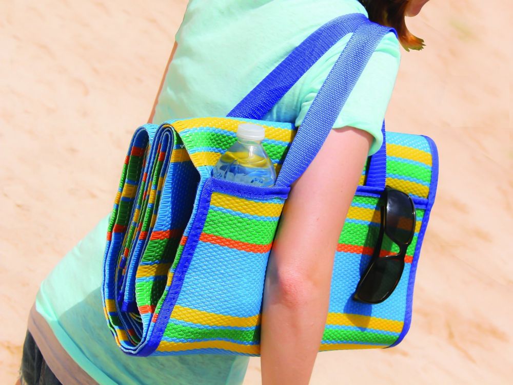 此款毯子尺寸为5x6英尺。可以在家里、草地或沙滩上使用。容易折叠,携带非常方便!折叠后象一个小包,两边还有小口袋可以存放外出需要的东西。上面还带提手,非常容易携带。 容易清洗。