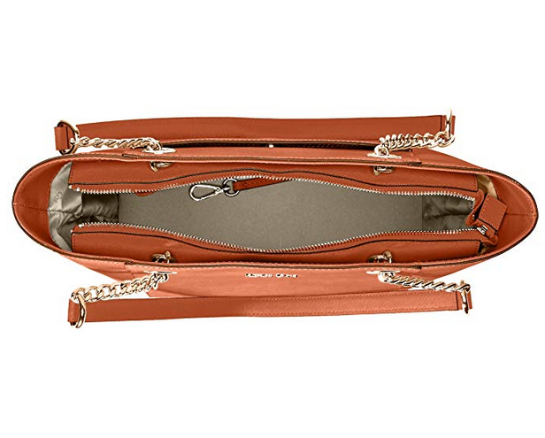 采用Saffiano皮,呈现十字纹路,磁扣开阖,内设拉链中袋,双层设计,还有1个拉链壁袋及多个滑袋,能合理归置物件;包包两边设有侧兜。平底可站立,底部设有铆钉,减少平日使用对包包的损害。双提手设计,皮质与链条相拼接,质感不错。尺寸约为25.4×30cm。