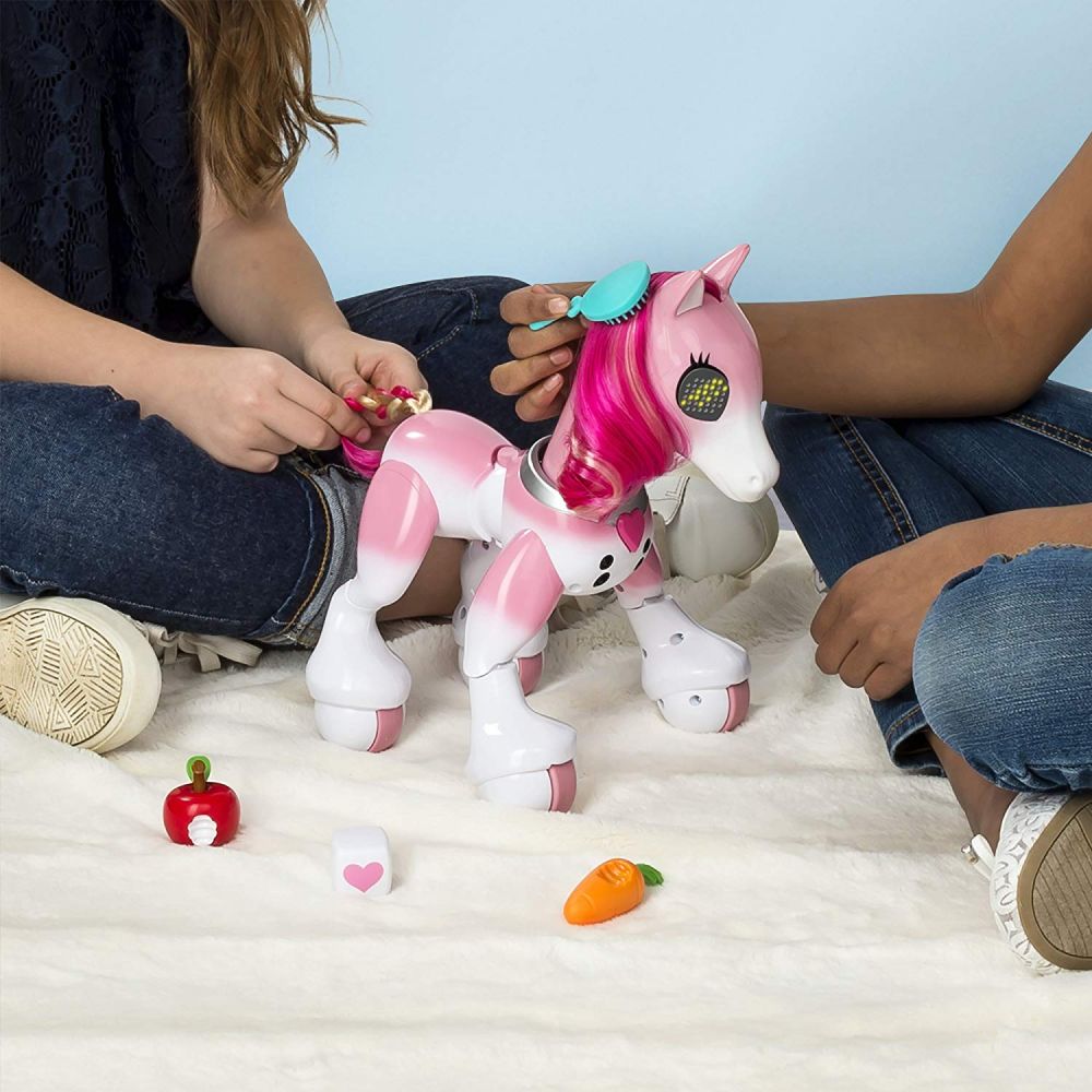 打开小马腹部 的开关,小马就会前进后退转圈圈哦~超级可爱。另外给小马喂食,或者梳理小马漂亮的马鬃,小马的眼睛里会出现小桃心,非常有爱。Zoomer Show Pony适用于5岁以上的儿童。这个玩具配有小零件。需要4节AA碱性电池(不包括在内)