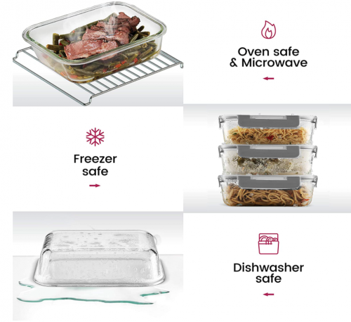 微波炉,烤箱,冰箱,洗碗机适用。玻璃容器不会吸收污渍或气味,使其成为酸性食物的完美选择。光滑的表面可以长时间保持食物的美味。创新密封盖子技术。