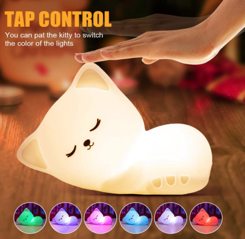小夜灯采用安全硅胶制成,双重认证。只需轻拍可爱的猫咪即可打开/关闭,并轻松切换7 种变色模式。