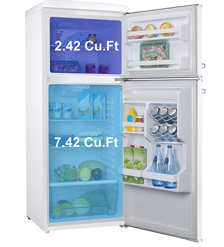 玻璃架子可以将您不同类型的食物分开。节能低噪音复古紧凑型冰箱采用R600a高效低能耗压缩机,以较低的能源快速冷却食物。