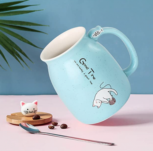 优质可爱猫陶瓷杯,包含可爱的竹盖和不锈钢勺子, 具有出色的隔热性能,容量为15 盎司。