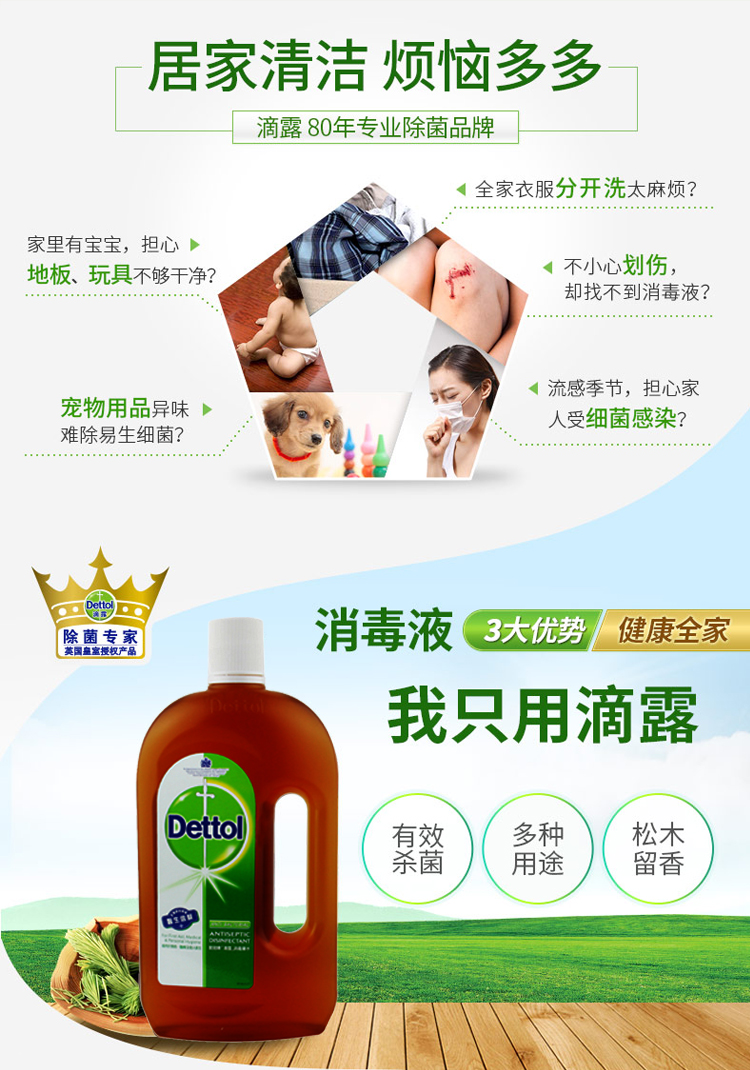Dettol Antiseptic 滴露消毒水,不管是洗手还是洗衣服都喜欢放一点,偶尔家居物品消毒也离不开。可以皮肤消毒、家居消毒、物品消毒。洗澡水中加一点点,可以预防身体痘痘的产生。有效杀灭99.99%细菌,使用时取适量加水稀释即可。