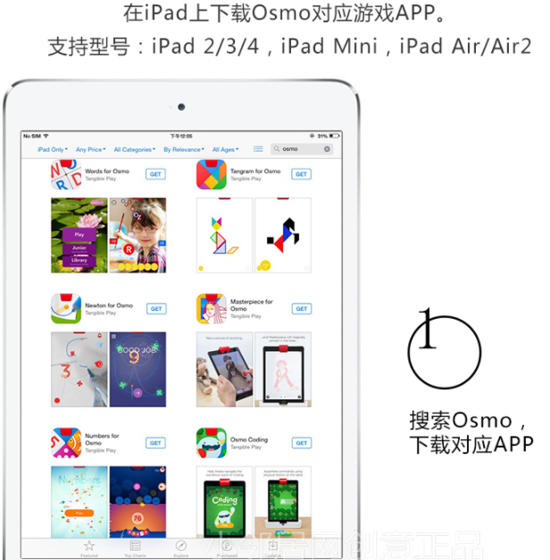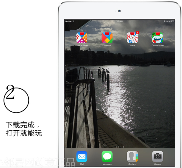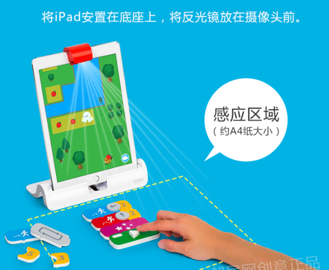 多次在国际上获奖。其游戏系统包括一个底座和一个红色的反光镜,将iPad置于底座内,再将反光镜置于iPad摄像头前,这样摄像头转而指向iPad正前方的一片区域,即游戏区域。游戏区域内的物体形状等信息可以反馈回iPad的Osmo应用程序,从而进行各类虚实互动的益智游戏。