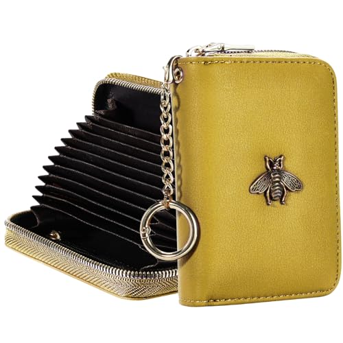 SEAVILIA 女士手风琴钱包,小型信用卡钱包钥匙扣钱包,带 RFID 屏蔽、钥匙扣和透明证件窗口(黑色), 黄色纳帕, 纯色